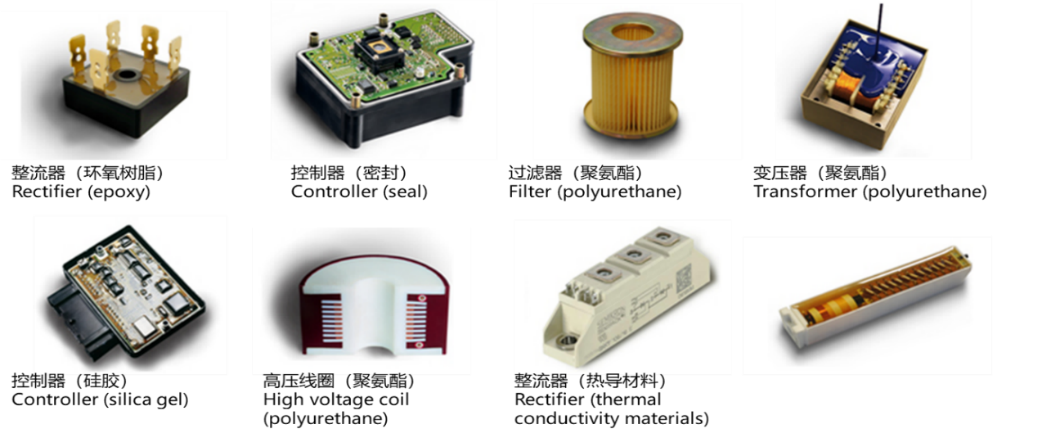 聚氨酯類、環(huán)氧樹脂類、硅橡膠類、丙烯基類、氨甲酸酯類、乳膠、厭氧膠類、醋酸乙烯、氰基丙烯酸酯類、熱融膠、聚酰亞氨類、UV膠、等樹脂粘接劑。